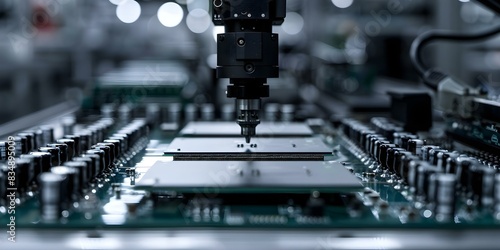 Robotic arm assembles processor circuit boards in electronics factory. Concept Industrial Robotics, Assembly Line Automation, Electronics Manufacturing