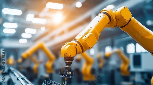 Robotic arm in action assembling components in factory