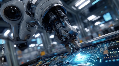 Robotic arm precisely assembling a complex circuit board in factory