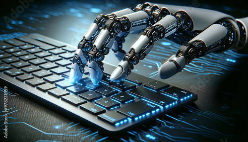 Robotic hand typing on a keyboard, symbolizing AI and technology.