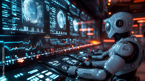 Robotic operator engaged in data analysis high-tech facility digital art futuristic environment close-up ai development