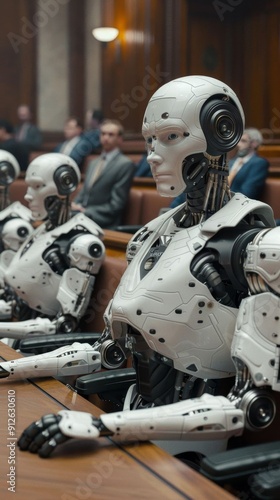 Robots serving as jurors in a courtroom setting, representing the integration of advanced technology in legal proceedings.