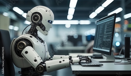 robots work in front of a laptop or computer. robots replace regular employees. Robot intelligence replaces human work. worker robots of the future. robot android