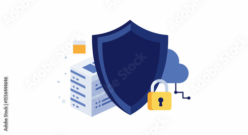 Robust Data Security and Network Protection Concept. Digital security illustration with a shield, password, servers, padlock, and cloud.