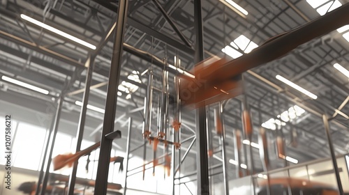 Rocket assembly facility interior showcasing advanced technology and precision engineering, where skilled technicians meticulously construct and test spacecraft components