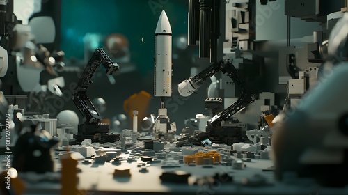 Rocket assembly facility with engineers working on advanced space technology, showcasing innovation and progress in aerospace engineering.