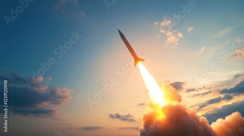 Rocket Launching into Sky with Bright Flames and Dramatic Clouds