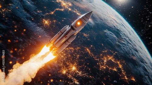 Rocket soaring past Earth into the starry universe.