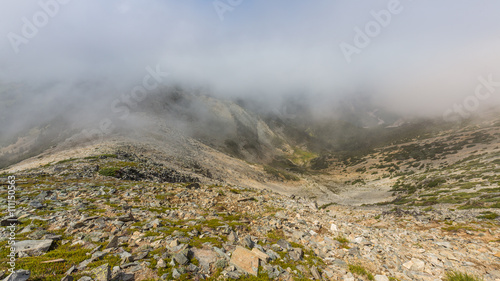 Rocky slopes in the mountains. Amazing view at the peaks which rose against the cloud sky. MOUNT FREMONT LOOKOUT TRAIL, Sunrise Area, Mount Rainier