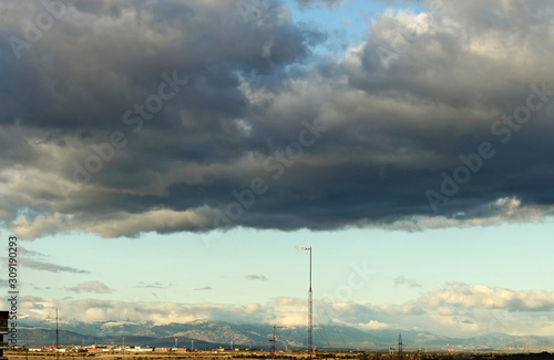 Rooftops and landscape, sky with clouds