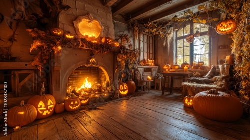 Room with a fireplace, stylishly decorated for Halloween. Festive interior setup.