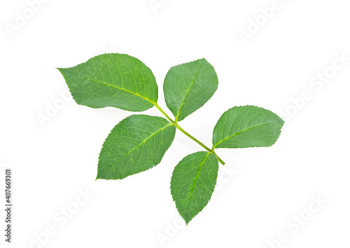 Rose leaves on white background