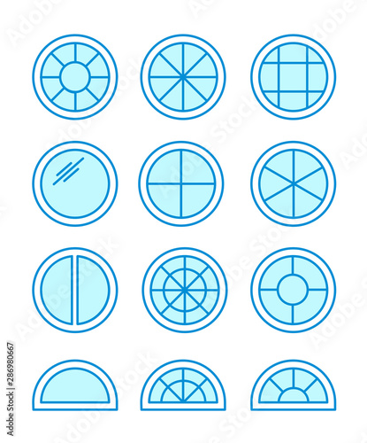 Round & circle window. Casement & awning window frames. Flat line icon set. Vector illustration. Isolated objects