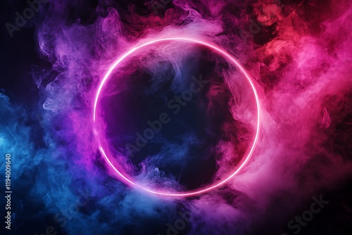 Round neon frame on a dark background with smoke