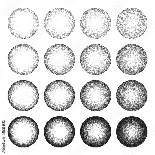 Round shaped dotted objects, stipple elements. Fading gradient. Stippling, dotwork drawing, shading using dots. Pixel disintegration, halftone effect. White noise grainy texture. Vector illustration