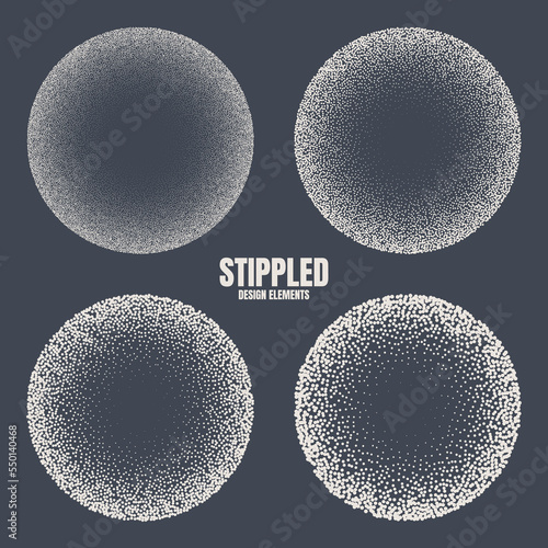 Round shaped dotted objects, stipple elements. Fading gradient. Stippling, dotwork drawing, shading using dots. Pixel disintegration, halftone effect. White noise grainy texture. Vector illustration