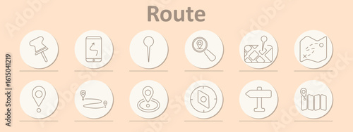 Route set icon. Pin, smartphone with path, map pointer, magnifier with pin, map with check, treasure map, location mark, path curve, locator, compass, direction sign, map with route bars.