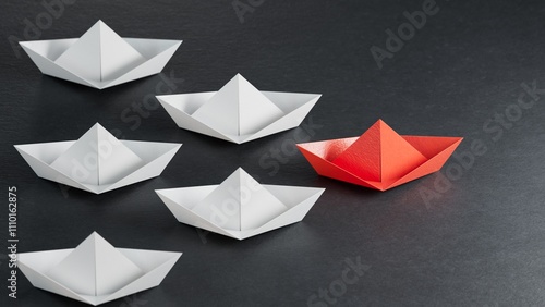 Row of paper boats. Business concept of creative innovation and leader boat. Flat lay red origami leader boat ahead of group white boats. Corporate strategy and successful solution.