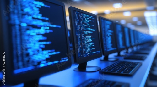 Rows of computers display coding languages, their blue glow creating a tech-centric, modern atmosphere in the lab