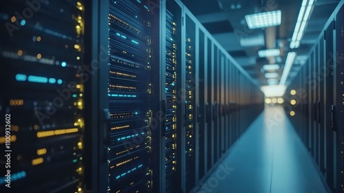 Rows of illuminated server racks fill a modern data center. Perfect for illustrating concepts of big data, cloud computing, and technology.