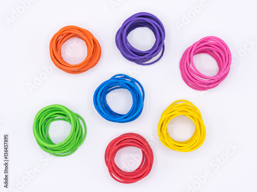 Rubber bands grouped by color on white background