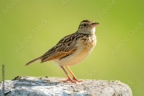 Rufous-naped lark stands on post facing right