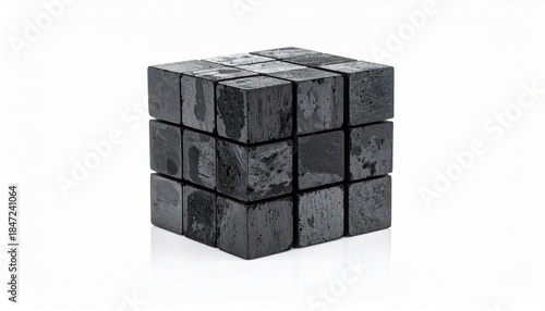 Rustic and intriguing dark textured cube puzzle on a clean white background, presenting a unique challenge in a minimalist setting, evoking contemplation and ingenuity