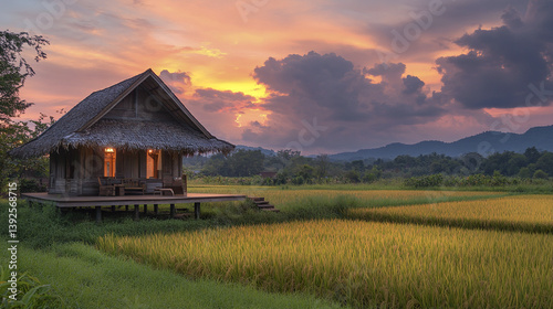 Rustic Thai house with sunset over rice fields, serene landscape