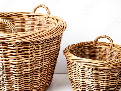 Rustic wicker basket with intricate weave, natural texture, sturdy handles, versatile storage or decoration, weave, decoration