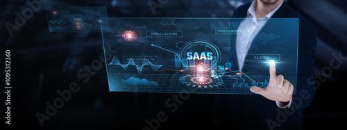 SaaS (Software as a Service): subscription models, user accessibility, data security, integration capabilities, real-time updates. Businessman analyzing SaaS progress chart on digital interface.