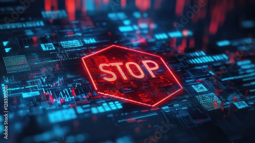 Safety barrier concept with a red stop sign over a financial dashboard, representing risk prevention methods