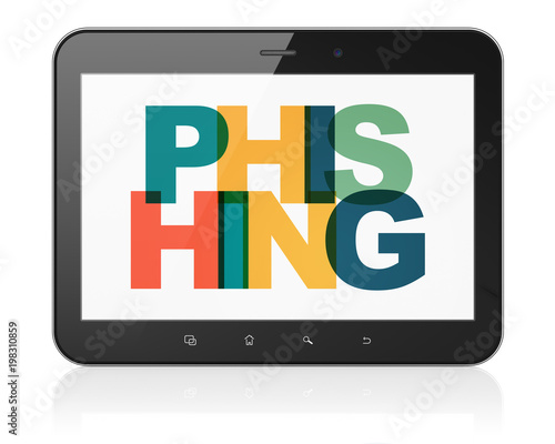 Safety concept: Tablet Computer with Painted multicolor text Phishing on display, 3D rendering