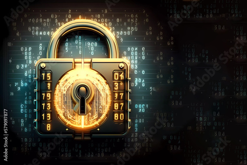 Safety lock. Lock with hacker virus code. Generative AI. Banner. Copy space.