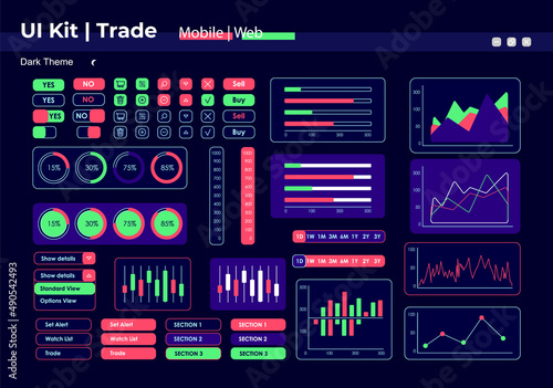 Sales performance insights UI elements kit. Commerce isolated vector dashboard components. Flat interface buttons template. Web design widget collection for mobile application with dark theme