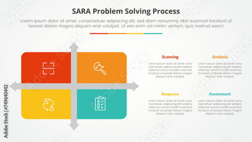 SARA model problem solving infographic concept for slide presentation with matrix structure with arrow shape divider with 4 point list with flat style