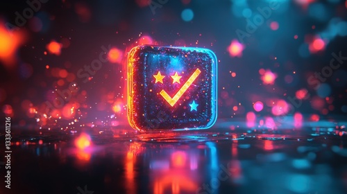 Satisfaction Icon and Button A glowing, animated button with a checkmark and five stars appearing and disappearing, creating a dynamic effect for user interfaces.