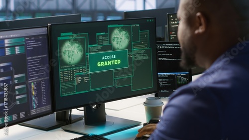 Satisfied server hub programmer pleased after installing cybersecurity framework, seeing access granted notification after reducing security incidents and enhancing data protection protocols, camera A