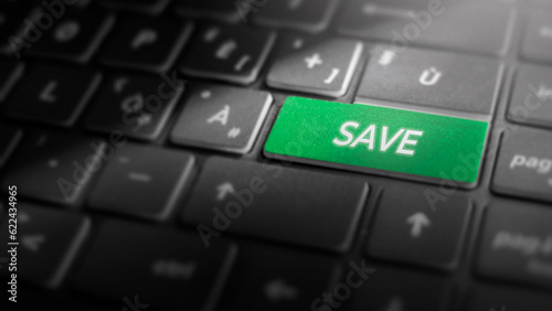 Save key on laptop computer keyboard, green button on the dark grey keybord of a modern laptop notebook, technology concept for file saving and data preservation, close-up