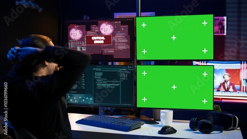 Scammer hacking using green screen PC and getting critical error notification while trying to infiltrate banking systems. Hacker runs script on chroma key display, failing to breach firewall, camera B