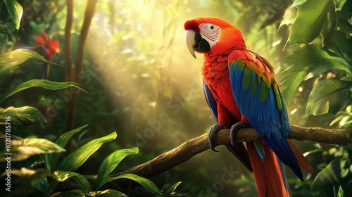 Scarlet Macaw Perched on Branch in Lush Tropical Rainforest