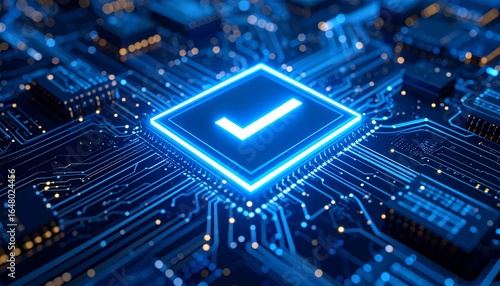 Scene with a glowing 3D check mark icon placed on a digital circuit board