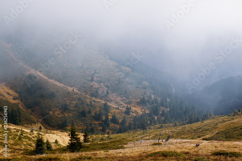 Scenery from Ciucas peak in the Carpathian Mountains, Romania, on a hazy autumn morning with fog lifting from a valley with fir trees.
