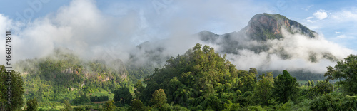 Scenic early morning rural landscape panorama with low clouds above valley and limestone mountain, Chiang Dao countryside, Chiang Mai, Thailand