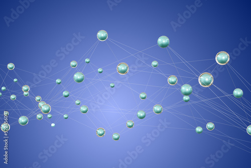 Scientific background. Round cells are connected by thin threads. Concept of communication between neurons. Background for scientific advertising. Round elements on blue. Scientific scenery. 3d image