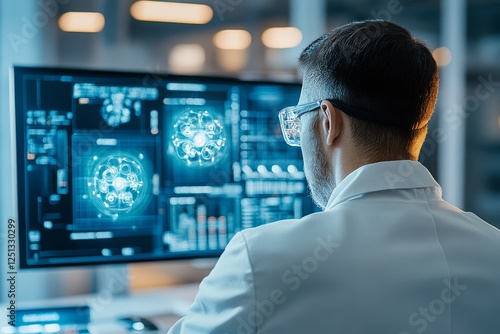 Scientist analyzes complex data on multiple screens in a modern laboratory during the day