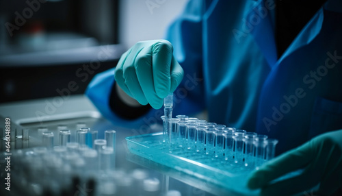 Scientist analyzing medical sample with blue liquid in laboratory generated by AI