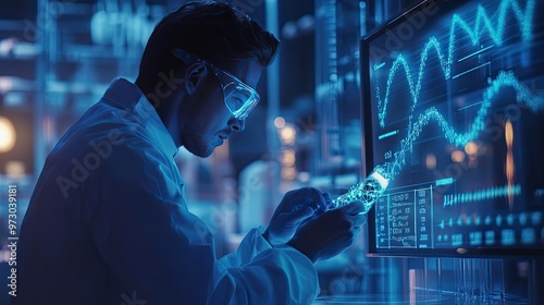 Scientist in a Lab Examining a Digital Model in Front of a Computer Monitor Displaying Data