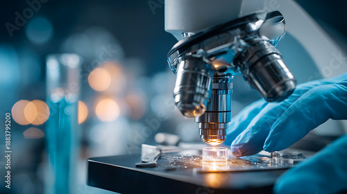 Scientist in blue gloves using a microscope in a laboratory setting