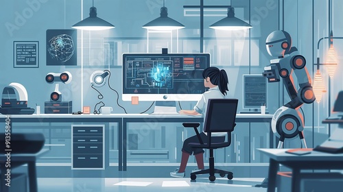 Scientist works on artificial intelligence project with robot assistant