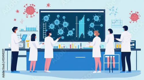 Scientists research virus, lab data analysis.